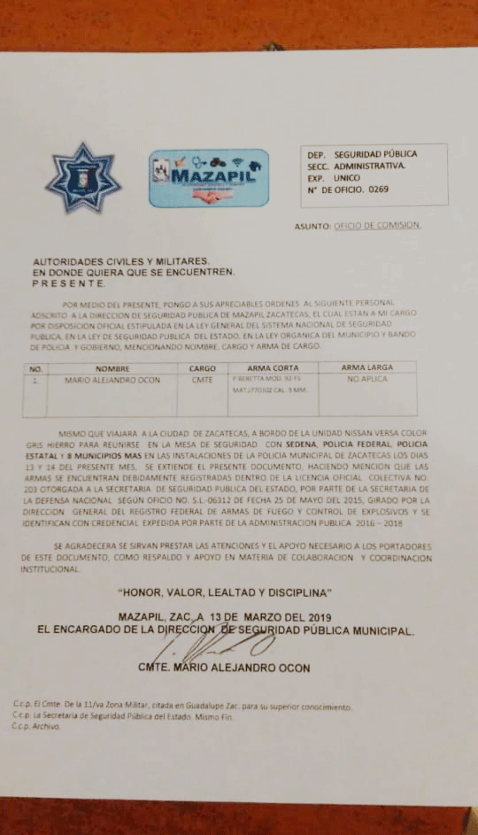 Mazapil, Zac.- Fue mediante el oficio de comisión No. 0269 que Mario Alejandro Occon, Encargado de la Dirección de Seguridad Pública Municipal, se autorizó a él mismo, la portación de un arma corta, durante su circulación a través de las carretas del estado de Zacatecas.
