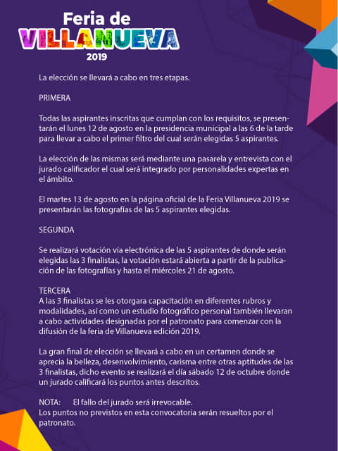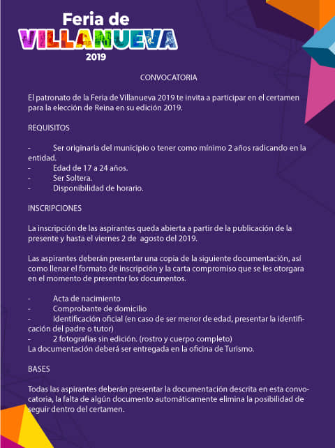 La #FeriaDeVillanueva2019 te invita a participar en el certamen de elección de #Reina en su edición 2019. Checa los requisitos e indicaciones, participa o denuncia a tu favorita.