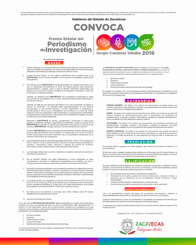 Zacatecas, Zac.– El Gobierno de Zacatecas invita a los periodistas de los distintos medios de comunicación, con sede en la entidad, a participar en el Premio Estatal de Periodismo de Investigación «Sergio Candelas Villalba» 2019, cuyo género es el Reportaje, con fecha límite para la recepción de trabajos el martes 15 de octubre del presente año.