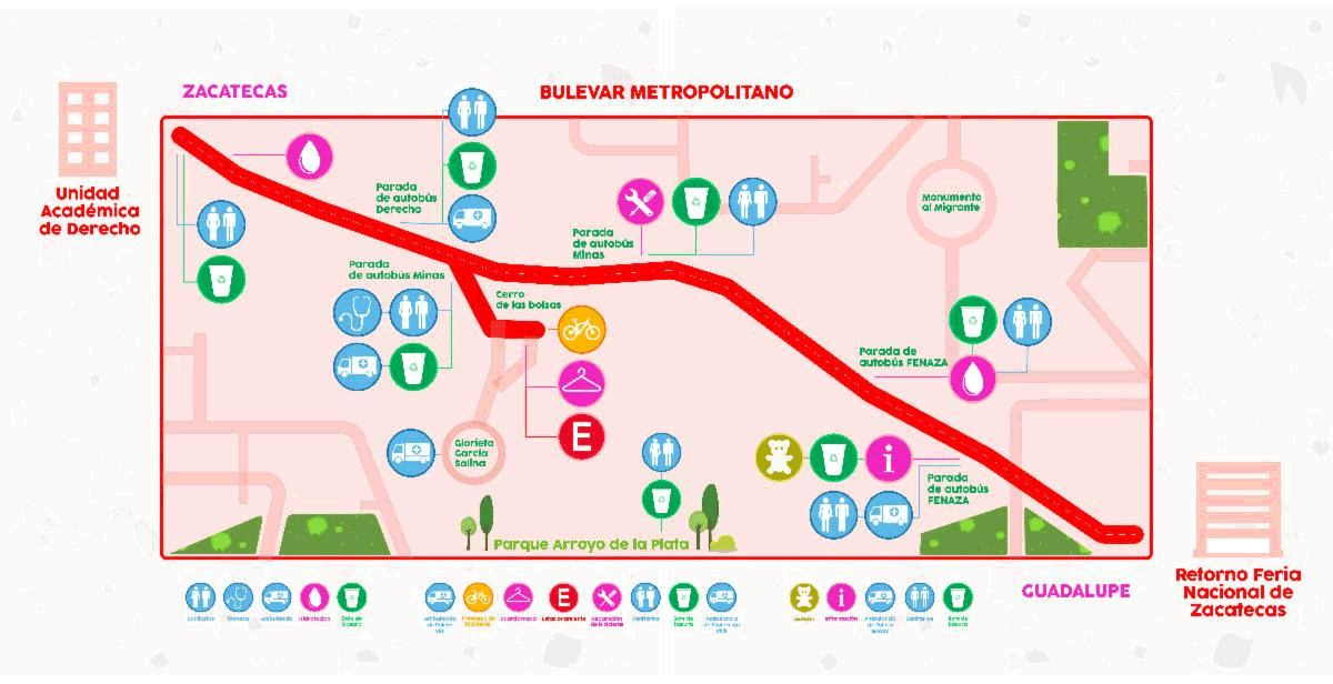 Con el fin de facilitar la llegada de los participantes en esta Ruta Dominical, se dispondrá de estacionamientos en Plaza Bicentenario, Estadio Carlos Vega Villalba, Megavelaria, Gimnasio Marcelino González, Teatro al Aire Libre, además de las avenidas Universidad y Preparatoria.