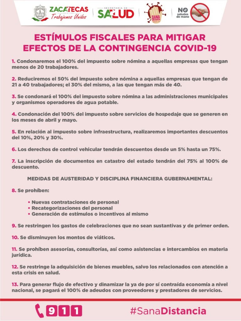 El Gobernador de Zacatecas dio a conocer que se condonará 100 por ciento del Impuesto Sobre Servicios de Hospedaje que se genere durante abril y mayo; asimismo, se harán descuentos de 10, 20 y 30 por ciento en Impuesto Sobre Estructura.