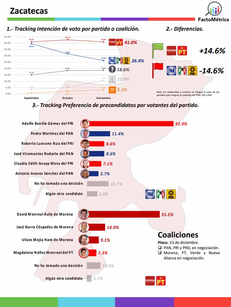 La coalición Morena, PT cuenta con el 41.0% de la preferencia en la intención del voto de los zacatecanos, en tanto que la coalición PRI, PAN, PRD, solo cuenta con 26.4% de esta misma preferencia; esto según el último sondeo realizado por FactoMétrica.