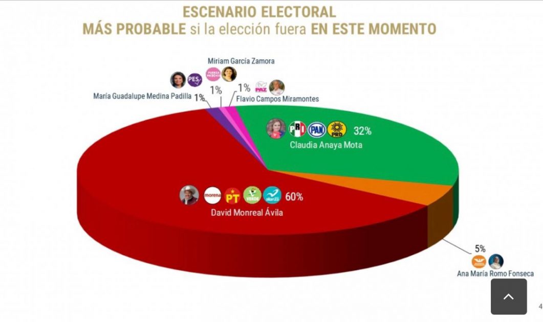 El candidato a la gubernatura por la Coalición Juntos Haremos Historia, David Monreal Ávila, aumentó su ventaja en la intención de voto del electorado zacatecano de acuerdo con la más reciente encuesta aplicada por Demotecnia, en la que el fresnillense se ubicó con el 60 % de las preferencias en el Escenario Electoral más probable si la elección fuera en este momento.