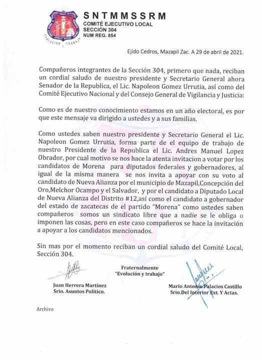 Así mismo, el escrito convoca a los sindicados a brindar el voto en favor de los candidatos de Nueva Alianza para presidentes municipales de los municipios de Mazapil, Concepción del Oro, Melchor Ocampo y El Salvador.