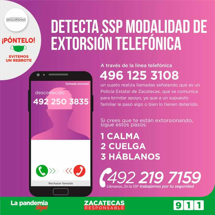 En ese sentido, en cumplimiento con uno de los ejes de la Estrategia de Seguridad Pública Integral para Zacatecas (ESPIZ) y con el compromiso de aplicar acciones que permitan prevenir estos delitos, se presenta el número y se solicita su difusión para que las y los zacatecanos no caigan en engaños y no sean víctimas de extorsión.