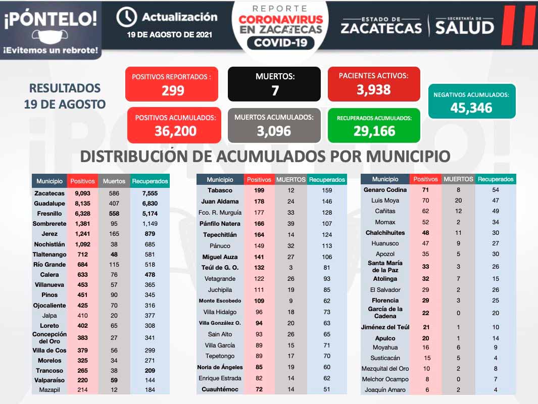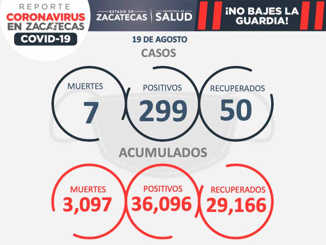 Zacatecas, Zac.- Este jueves, la Secretaría de Salud de Zacatecas (SSZ) reportó 299 nuevos contagios de COVID-19; 50 recuperados y siete fallecimientos.