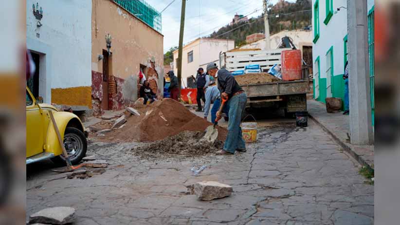 Ahí, el alcalde Jorge Miranda Castro, acompañado del secretario de Servicios Públicos, Miguel Ángel Félix, evaluó el trabajo de bacheo en la calle Del Ángel, donde comenzaron a instalar adoquín irregular con mortero de fraguado rápido.
