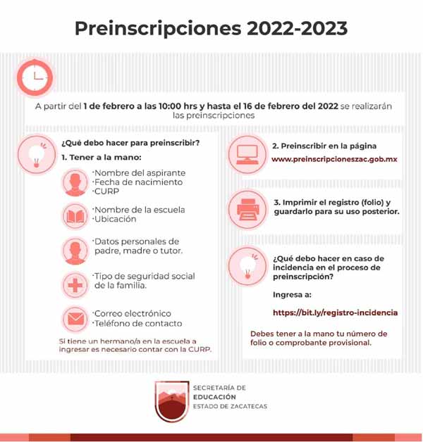Zacatecas, Zac.- Este martes 1 de febrero, en punto de la 10 de la mañana, comenzarán las preinscripciones para ingresar a los niveles de preescolar, primaria y secundaria.