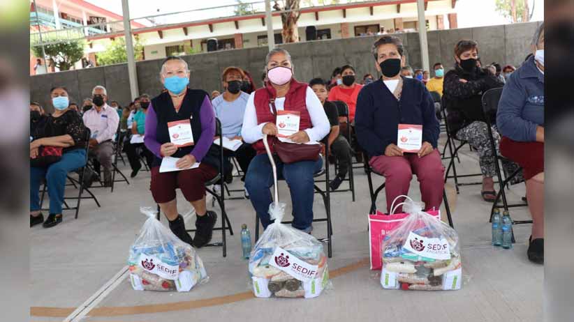 Ma. Patrocinio Salcedo, Hermelinda Rodríguez y María del Rosario Raudales, en una entrega simbólica recibieron los tarjetones junto al apoyo alimentario de manos de la presidenta honorífica del SEDIF, Sara Hernández de Monreal, a quienes les reiteró el compromiso de seguir velando por las familias.