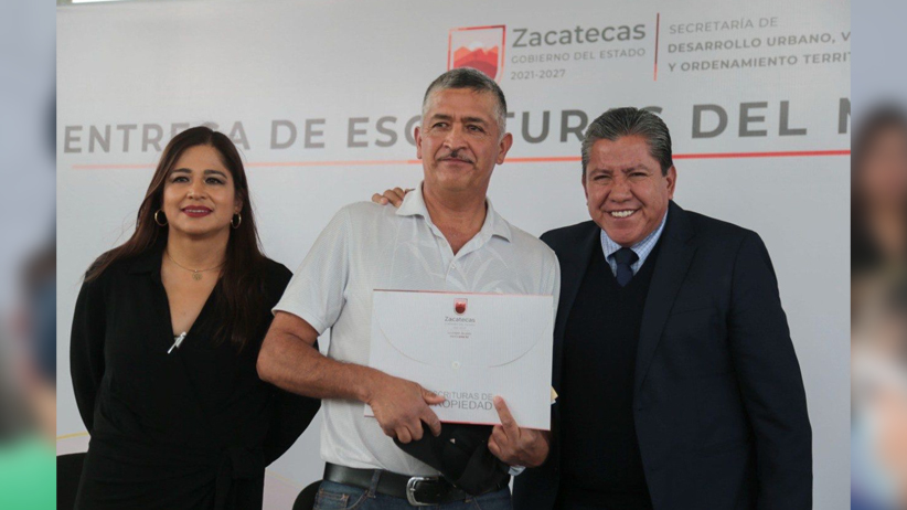 Acompañado por Ruth Calderón Babún, síndica del Ayuntamiento de Zacatecas, el Gobernador David Monreal entregó 75 escrituras a igual número de familias e instruyó a Laura Elvia Bermúdez Valdés, titular de la Secretaría de Desarrollo Urbano, Vivienda y Ordenamiento Territorial (Seduvot), para que se dé celeridad en el trámite de otras 54 faltantes en esa zona de la capital zacatecana.