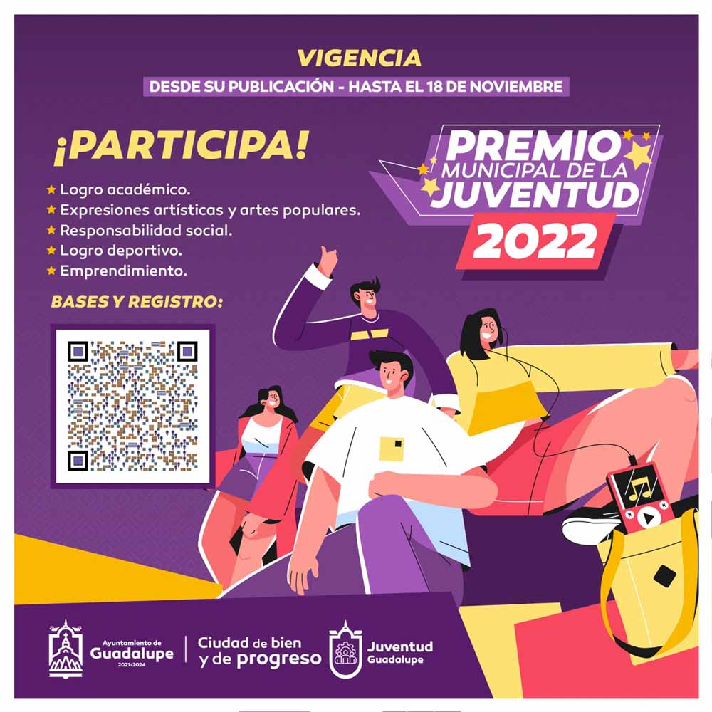 Con el objetivo de reconocer la participación de las y los jóvenes en la construcción de un municipio de paz y bienestar, el Ayuntamiento de Guadalupe que encabeza el alcalde, Julio César Chávez Padilla, a través de la Dirección Municipal de la Juventud, dio a conocer la convocatoria correspondiente al Premio Juvenil 2022.