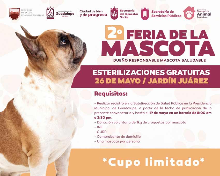 La Ciudad de Guadalupe, Zacatecas, a cargo del Presidente Municipal, José Saldívar Alcalde, a través de la Subdirección de Salud Pública de la Secretaría de Bienestar Social convoca los establecimientos con giros de veterinarias, tiendas de artículos para mascotas, estéticas caninas, entre otros, a participar en esta, la Segunda Feria de la Mascota, cuyo lema es ‘Dueño responsable, mascota saludable’.
