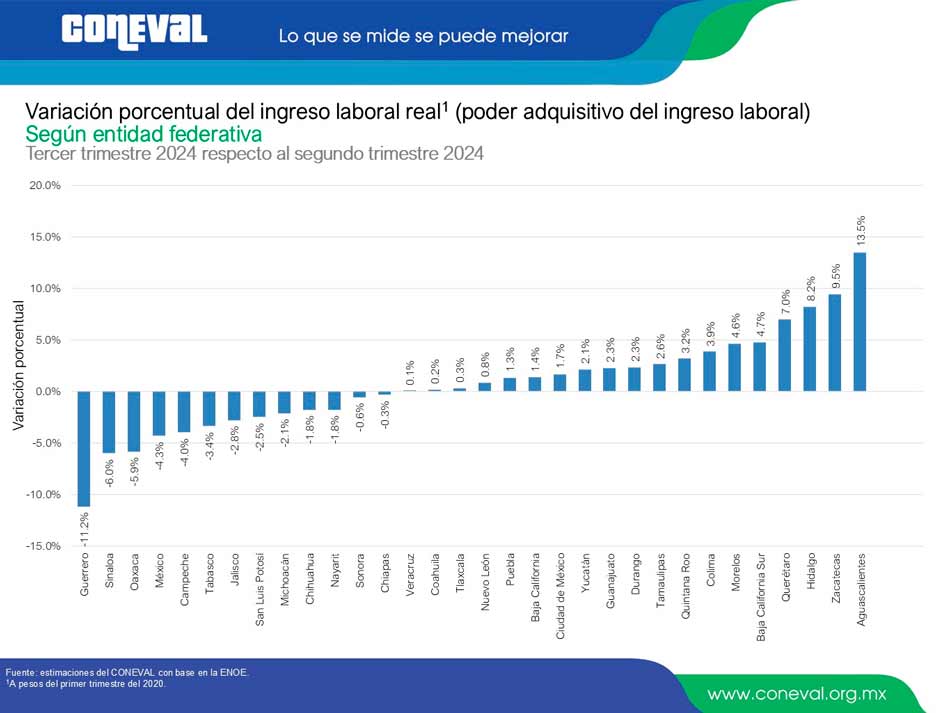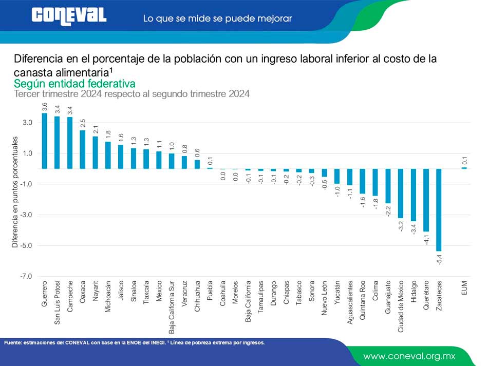 Con una disminución de 5.4 puntos en el porcentaje de población en pobreza laboral, en comparación con el segundo trimestre del año, Zacatecas ocupa el primer lugar nacional en avances en este indicador, seguido por Querétaro, con una reducción de 4.1 puntos, e Hidalgo, con una disminución de 3.4 puntos.